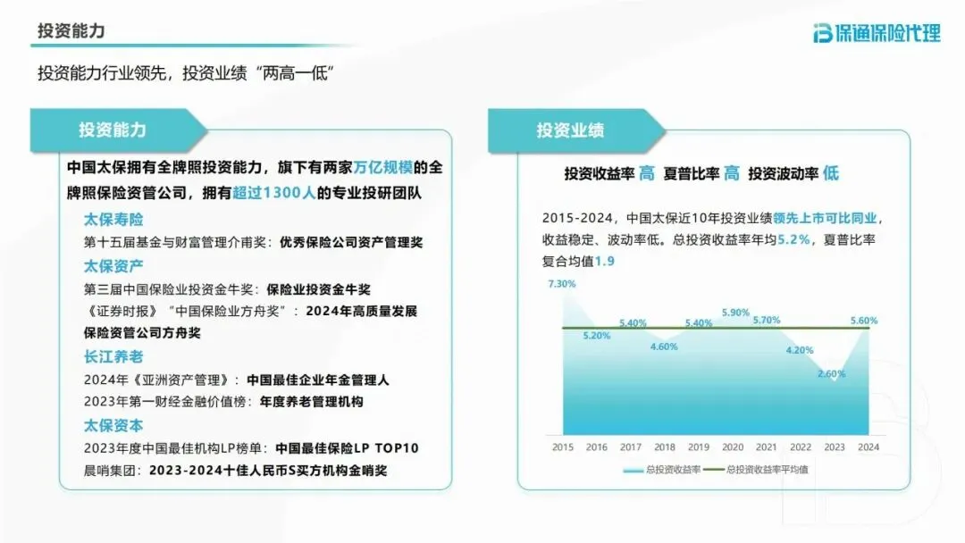 太平洋保险拥有全牌照投资能力,旗下两家万亿规模保险资管公司,配备超1300人的专业投研团队。2015-2024年近10年总投资收益率年均5.2%,夏普比率复合均值1.9,实现“高收益、高夏普比率、低波动率”的优质业绩。