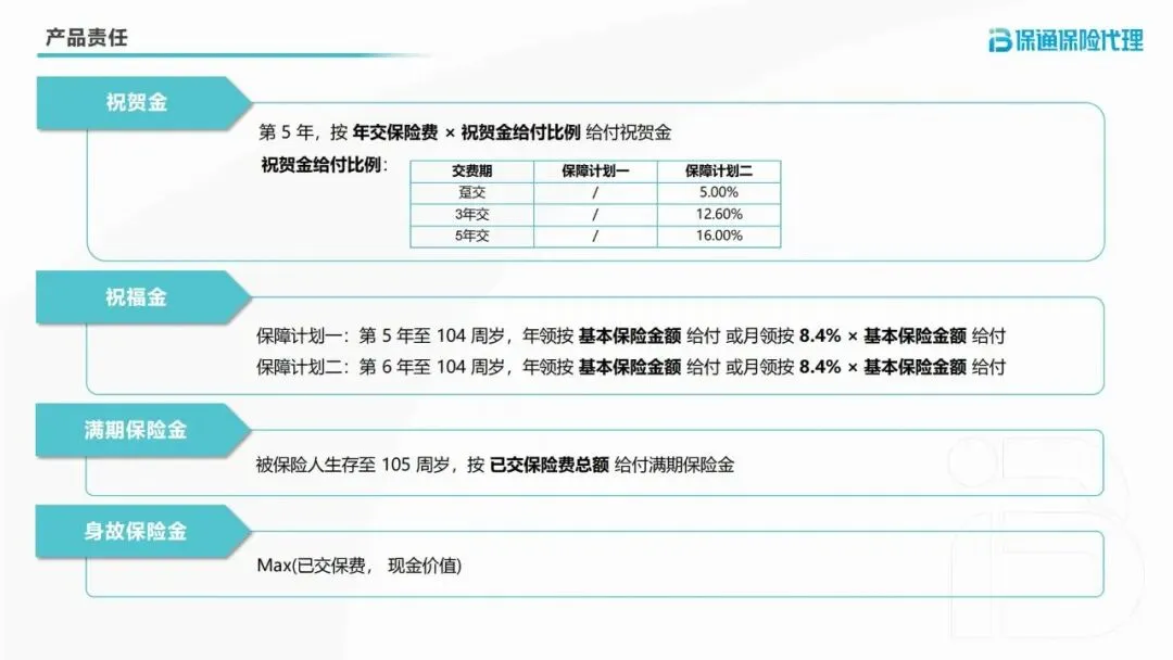2.祝福金:两种领取方案自由选。保障计划一从第5年至104周岁,保障计划二从第6年至104周岁,可选择年领100%基本保险金额,或月领8.4%×基本保险金额,每月/每年一笔稳定现金流,从容覆盖生活开支。
