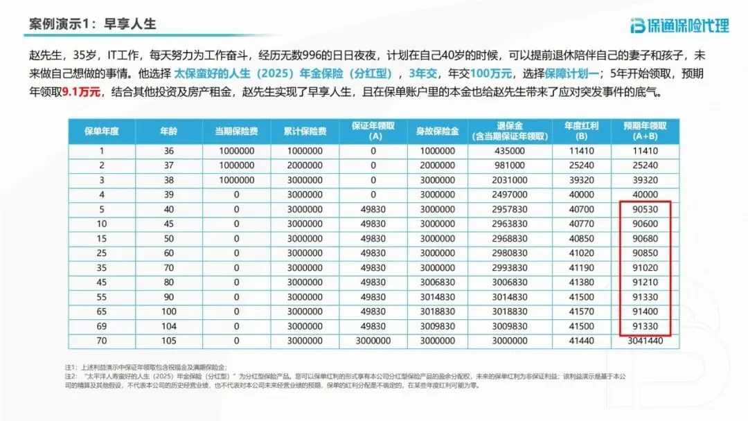 提前退休,品质生活不打折。35岁的赵先生,IT从业者,希望40岁提前退休。选择3年交,年交100万元,保障计划一。第5年(40岁)起,每年保证领取4.983万元,叠加年度红利后预期年领取约9.1万元,结合其他投资与房产租金,轻松实现退休目标,保单现金价值还能应对突发事件,安全感满满。