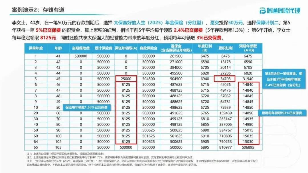 替代存款,收益更优更灵活。40岁的李女士,50万元存款到期后选择趸交投保,保障计划二。第5年可领取5%已交保费的祝贺金2.5万元,前5年平均每年领取相当于已交保费2.4%的收益(远超5年存款1.3%的利率);第6年起,每年稳定领取8125元祝福金,叠加年度红利后预期年领取约3%已交保费,既守住本金,又能实现持续增值。