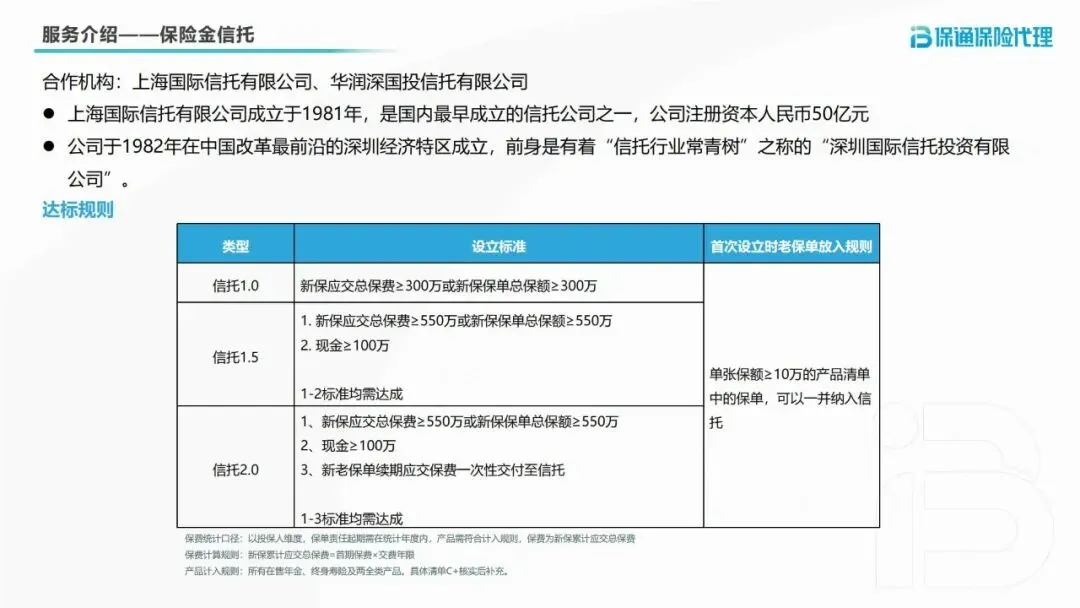 4.保险金信托服务:与上海国际信托有限公司、华润深国投信托有限公司两大知名机构合作,新保应交总保费≥300万或总保额≥300万即可对接。通过信托架构实现财富的精准传承与灵活管理,满足高净值客户的资产规划需求。