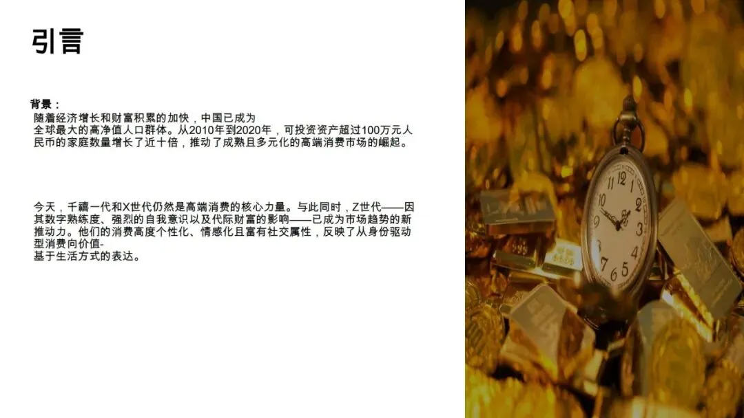 随着中国经济的持续增长和财富积累,高净值人群规模已跃居全球首位。从2010年到2020年,可投资资产超过100万元人民币的家庭数量增长近十倍,催生了成熟多元的高端消费市场。