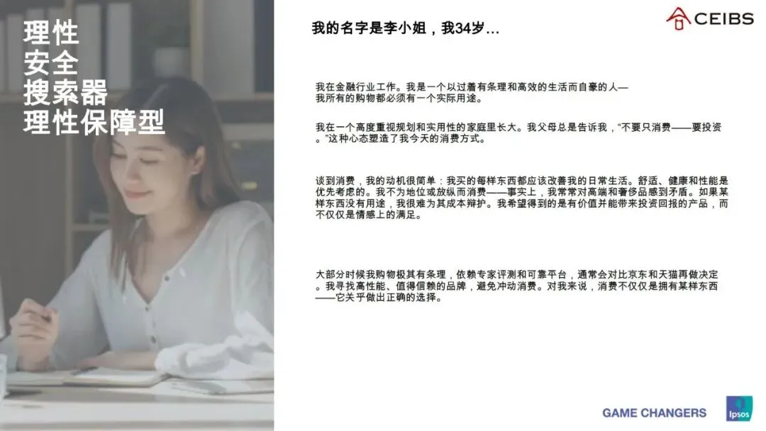 核心特征:理性、自律、高效,消费目标明确,注重品质、成本效益和生活方式提升的平衡。80后更关注家庭安全和价值,90后倾向“智能花费”和产品评论参考。消费行为上,购物有条理,依赖专家评测和可靠平台,避免冲动消费,优先选择高性能、值得信赖的品牌,不为地位或放纵消费,重视产品的实际用途和投资回报。金融、健康医疗、旅行是其主要消费领域,偏好人工智能退休规划、精准健康科技等实用型产品。