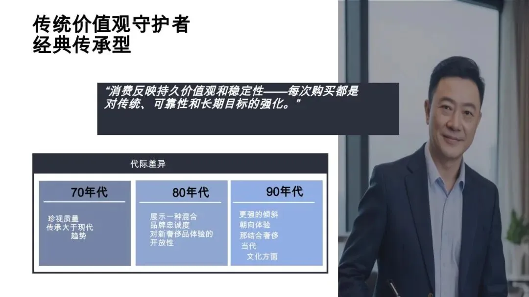 核心特征:重视责任、遗产与社会尊重,消费反映持久价值观和稳定性,偏好可靠品牌和长期价值。70年代人群珍视质量传承,80年代人群兼顾品牌忠诚度与新体验,90年代人群更倾向融合奢侈与当代文化的体验。消费上实用主义导向,医疗保健产品、家用电器等有明确用途的产品是首选,渠道上偏爱线下购物,重视产品体验和人际信任,收藏品领域青睐古董、玉、金等具有传承价值的物品。