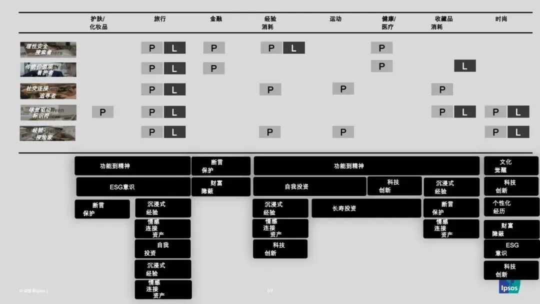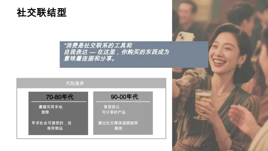 核心特征:外向、敏感、乐观,消费是社交连接和自我表达的工具,注重产品的可分享性和潮流属性。70-80年代人群遵循实用本地推荐,90-00年代人群喜欢通过社交媒体追随趋势,偏爱有表现力的产品。消费行为上,易受网红、直播和推荐平台影响,忠诚于能带来社区归属感的品牌,时尚、体验消费、运动是主要支出领域,NFT收藏品、智能健身装备、可持续旅行产品等兼具社交属性和潮流感的产品备受青睐。