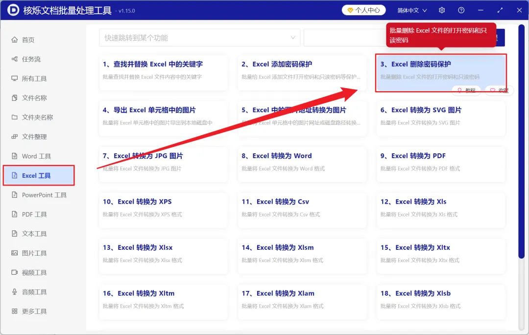 1、打开【核烁文档批量处理工具】,找到【Excel 工具】里面的【Excel 删除密码保护】。