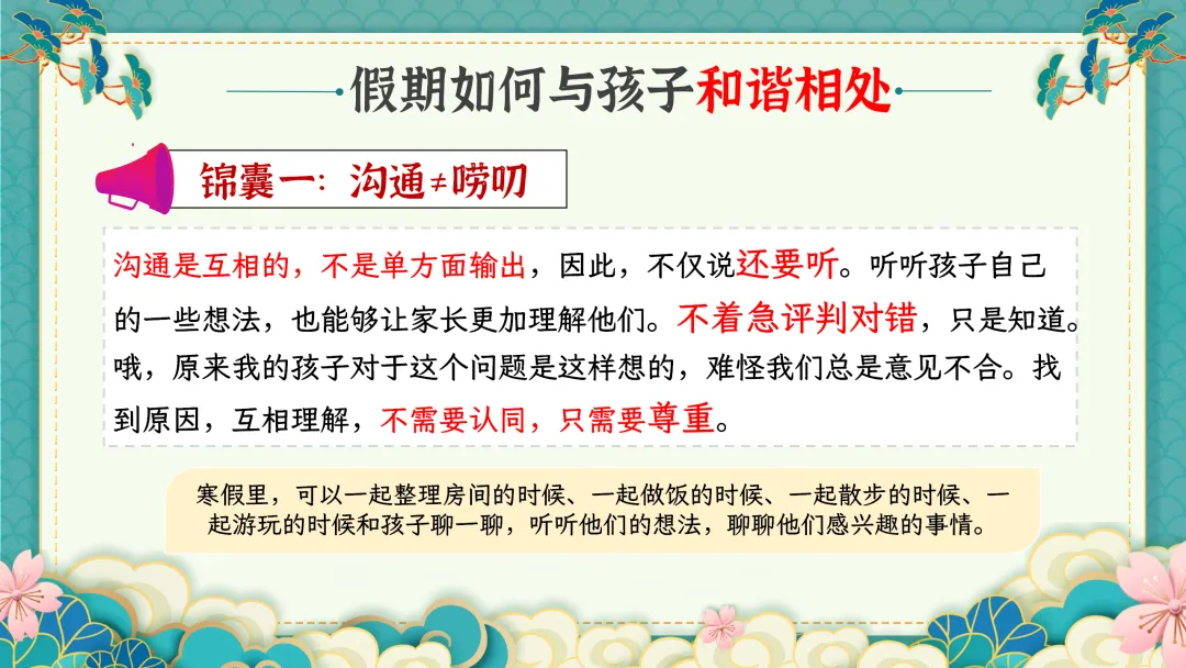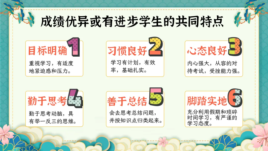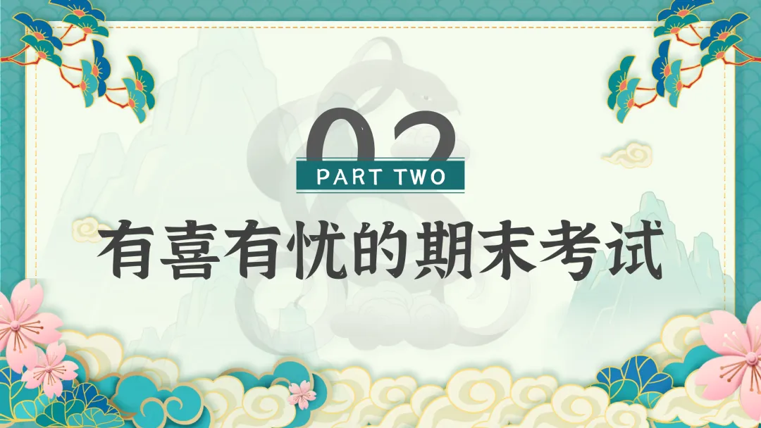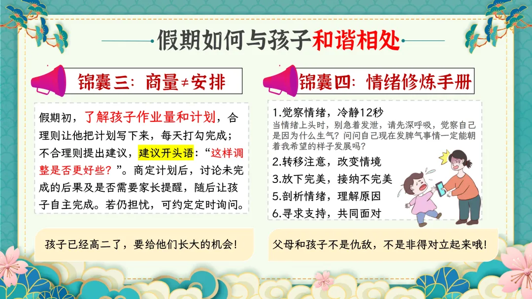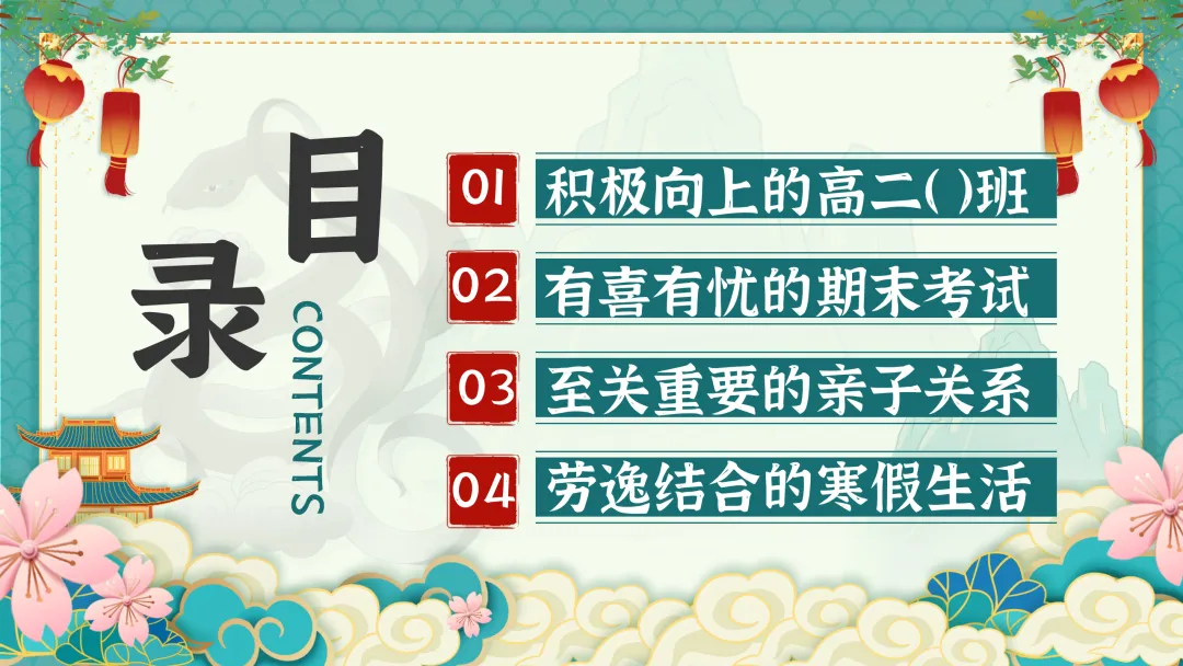 在这关键的高二阶段,教育的协同力量至关重要。此刻,站在学期尾声,我们相聚于此,就是要静下心,一同回望高二这一路的风景与坎坷,精准把握孩子们当下的学习、生活与心理状态。本次家长会主要内容分4部分:01积极向上的高二( )班;02有喜有忧的期末考试;03至关重要的亲子关系;04劳逸结合的寒假生活。