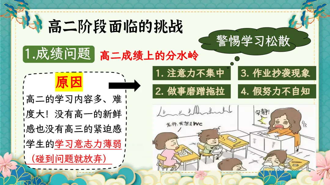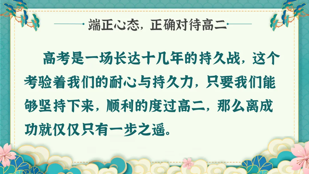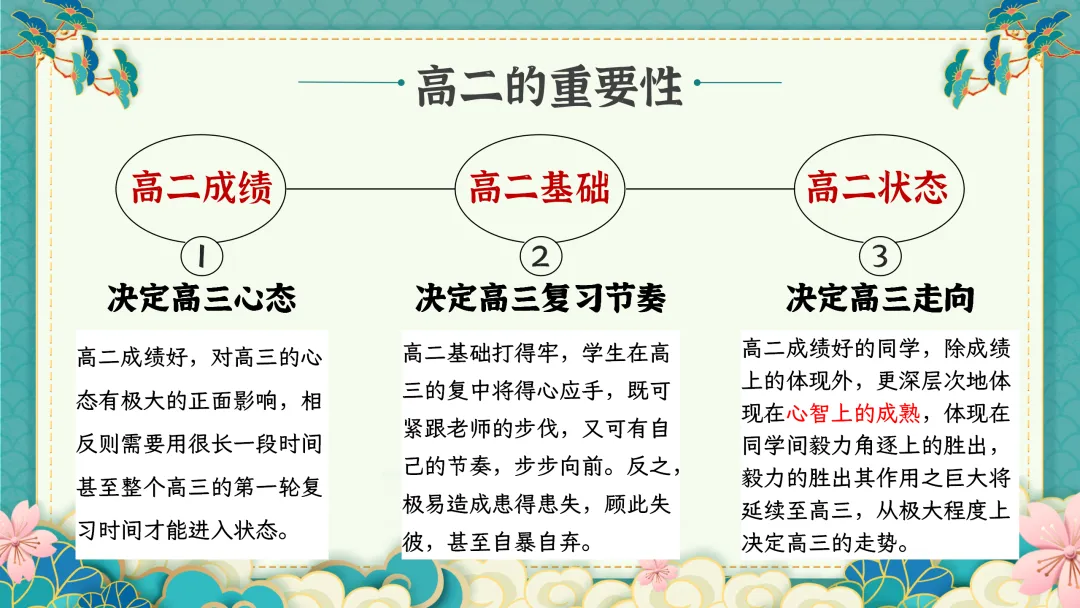 ①高二的成绩将决定高三的心态:高二成绩好,对高三的心态有极大的正面影响,②高二的基础将决定高三复习的节奏③高二的状态将决定高三的走向高二阶段面临的挑战