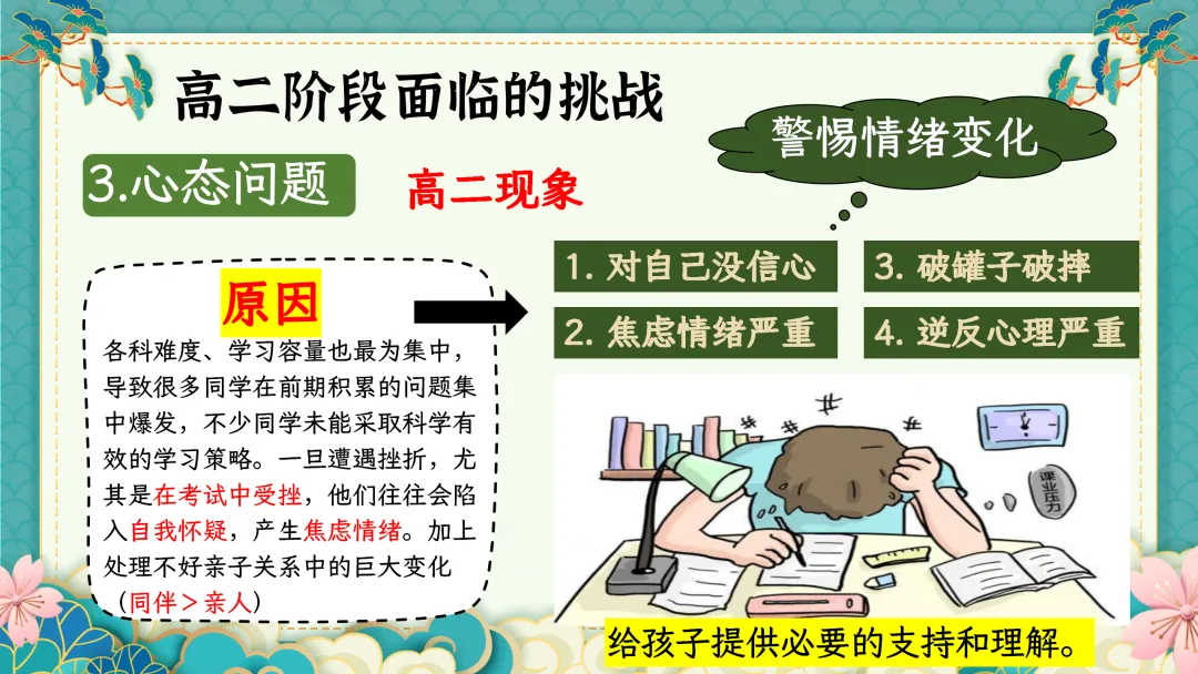 高二,恰似一场马拉松赛程中的关键弯道,既承接了高一的青涩奠基,又开启向高三巅峰冲刺的蓄力前奏。然而,我们也深知,成长之路布满荆棘。步入高二,学业压力呈指数级增长,各学科知识深度挖掘、综合运用的要求愈发严苛,频繁的考试、起伏的成绩,如同汹涌浪潮,不时冲击着孩子们的内心防线。与此同时,他们正处于身心快速发展的青春期,情绪波动、自我认知迷茫等问题也悄然滋生。