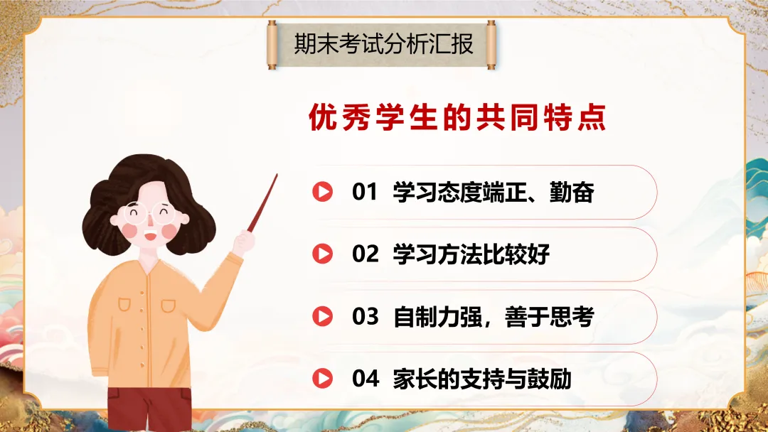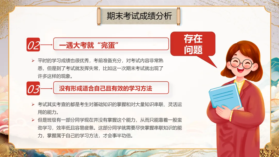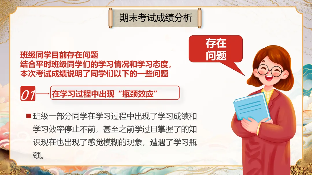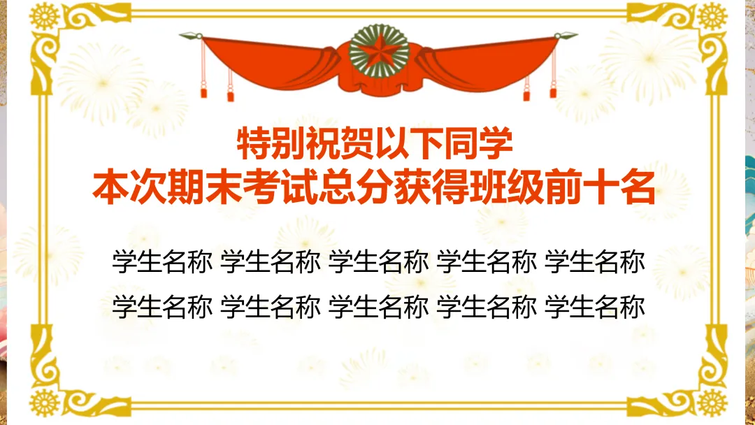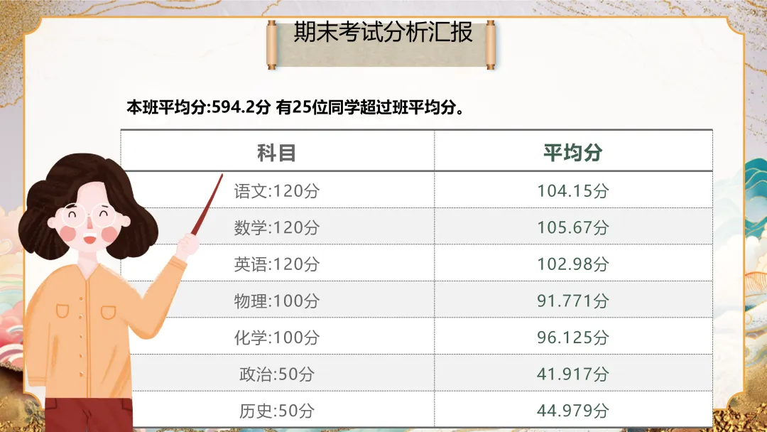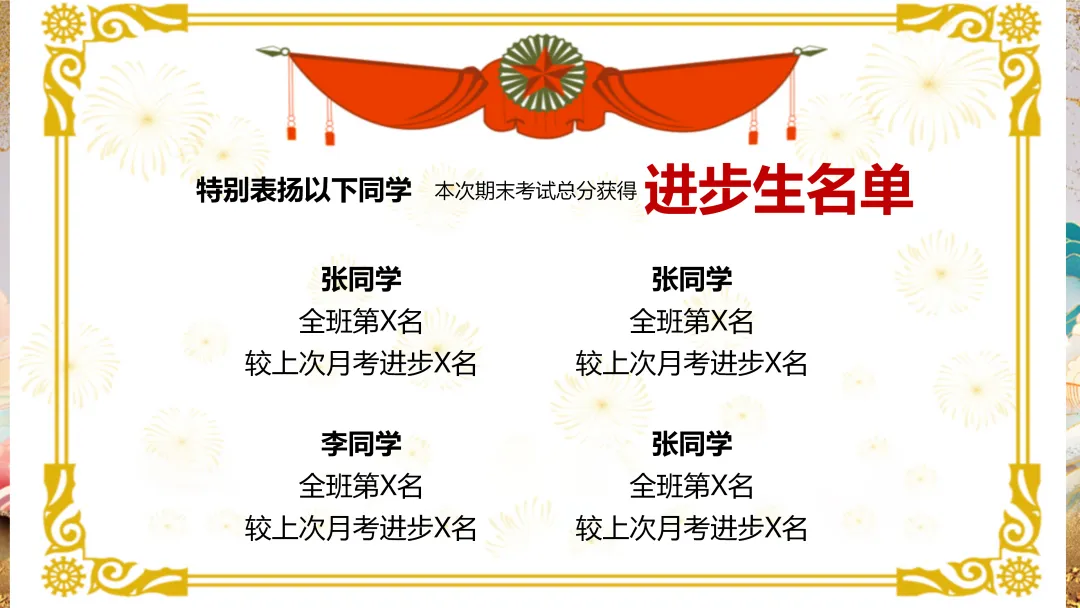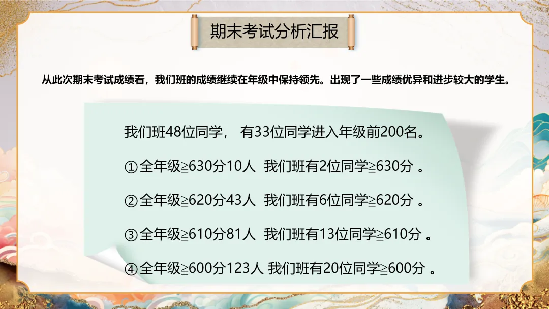 从此次期末考试成绩看,我们班的成绩继续在年级中保持领先。出现了一些成绩优异和进步较大的学生。