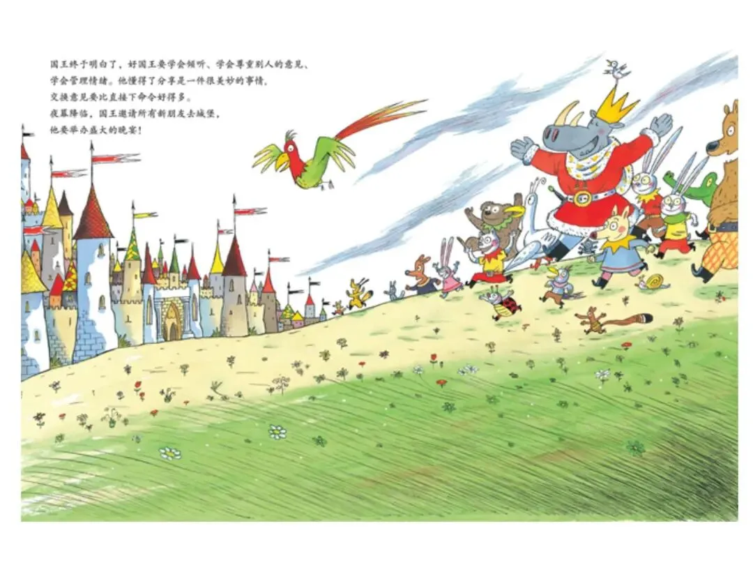 拥有至高权力与财富的国王,却始终得不到渴望的爱。他举办华丽时装秀、用黄金铺满城堡、发起决斗炫耀力量,可大家都因他的暴躁与霸道纷纷远离。直到走出城堡,遇见一群快乐的孩子与小动物,国王才在它们的引导下学会轻声沟通、尊重他人、主动分享。放下君主架子的他,终于明白爱从不是命令或炫耀能换来的,而是双向奔赴的温暖与真诚,最终收获了满溢的友爱与幸福。