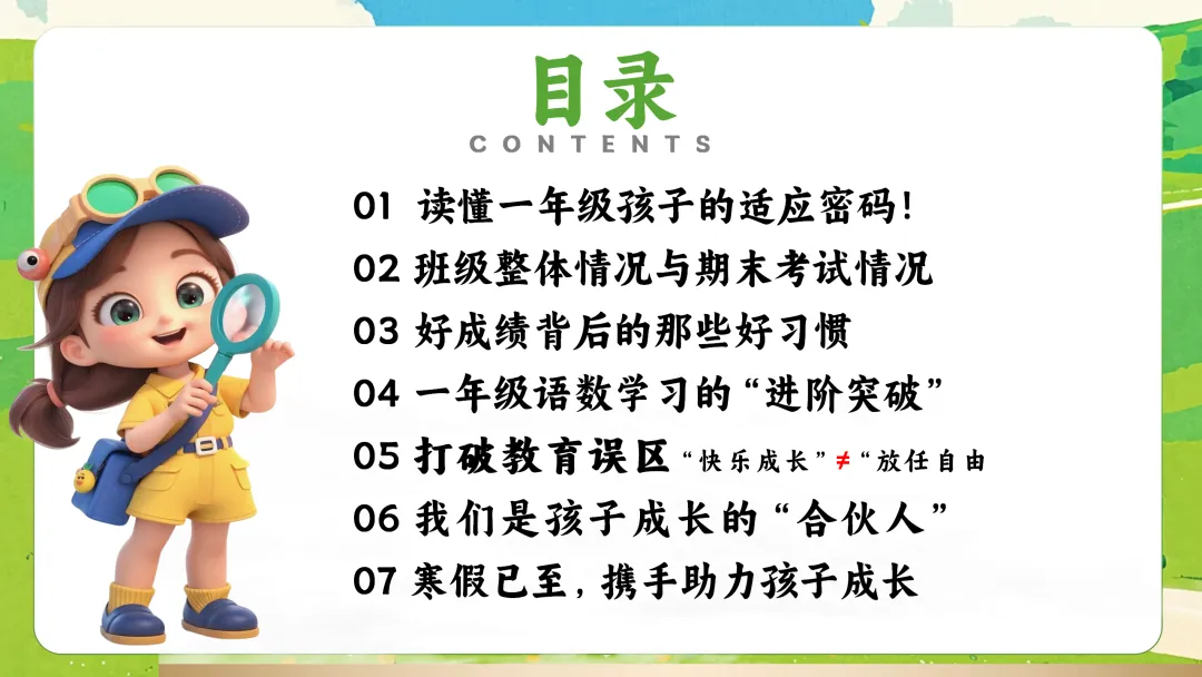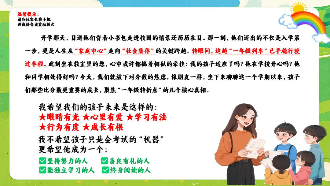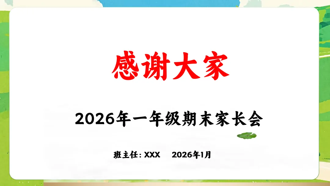 很高兴在这与您相遇,如果您是一位班主任老师,每天除了应对繁重的教学工作,还要加班整理班级、教务、教研、课件PPT资料,请关注下方的“春雨教务资料”,让我们风雨同路、一起成长~今天分享的是一年级期末家长会的ppt课件和发言稿,主题是《一年级列车已过半》