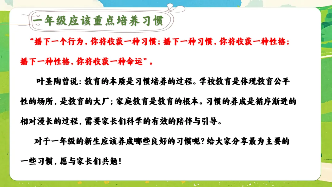 教育家叶圣陶先生说:“教育的本质就是培养习惯。”对于一年级的孩子来说,知识的获取是相对容易的,但良好习惯的养成,却是一项艰巨而伟大的工程。它决定了孩子这趟“学习列车”未来能跑多快、多远、多稳。