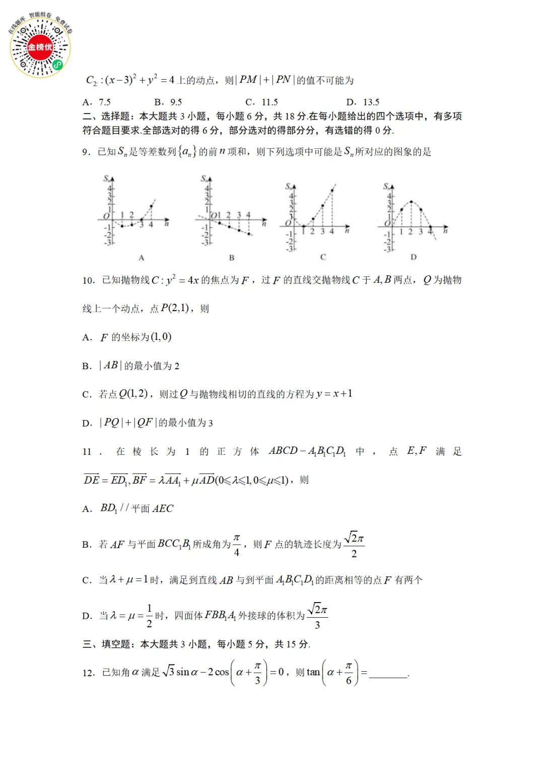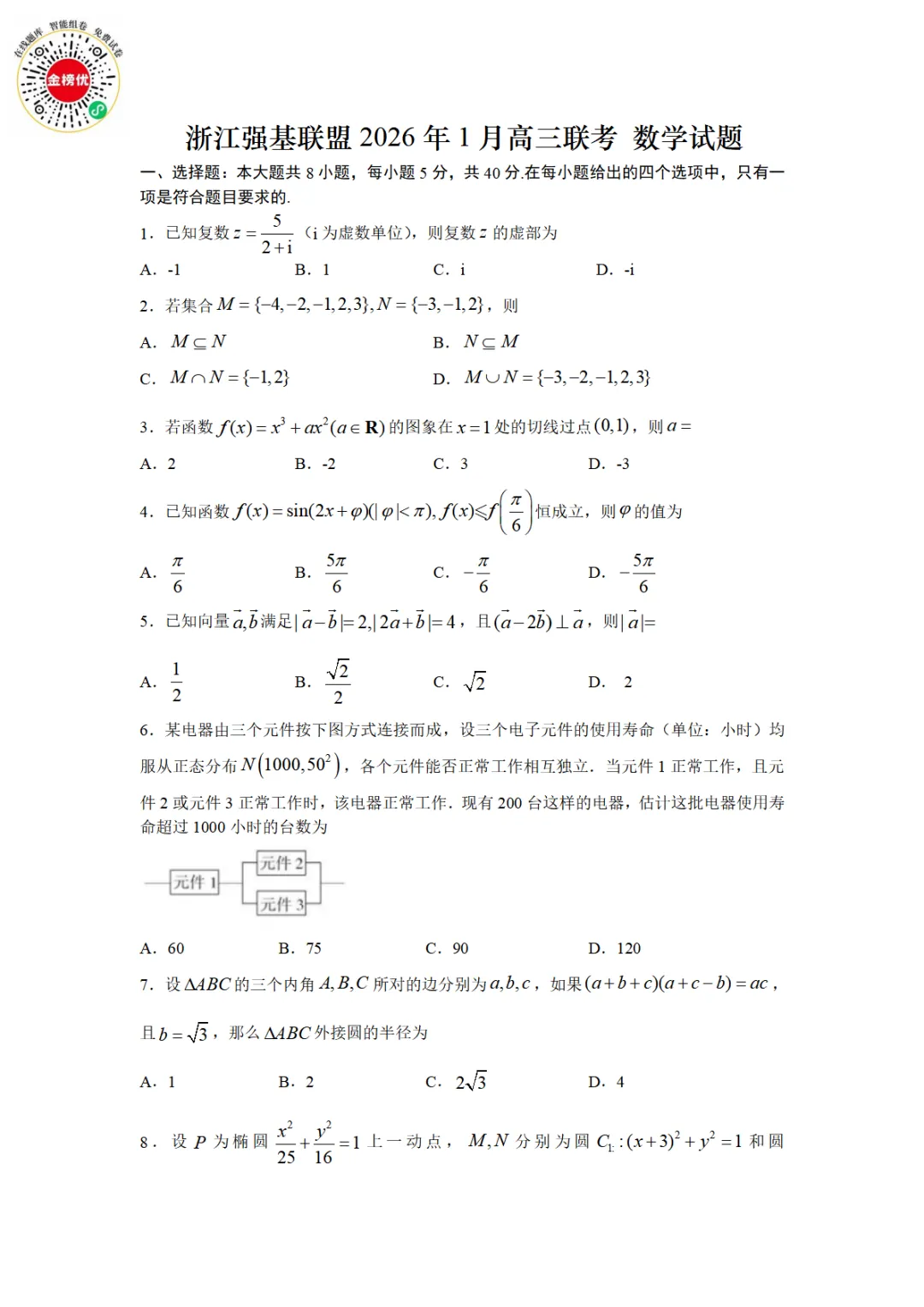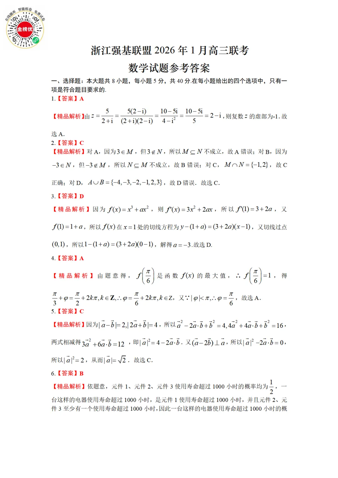 【精品word版】2026年浙江强基联盟高三1月联考数学试题+答案