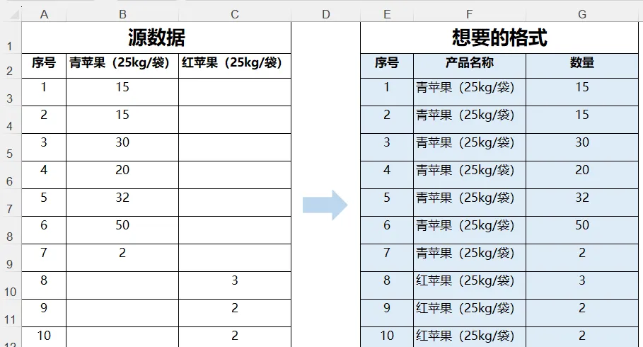 有一张苹果销售记录表,其中“青苹果”和“红苹果”的数据分别记录在两列中,每一行只会有其中一种苹果的销售数量。这样的表格虽然录入方便,但不利于后续的统计与分析。我们希望能将其整理为“序号-产品名称-数量”的标准三列格式。
