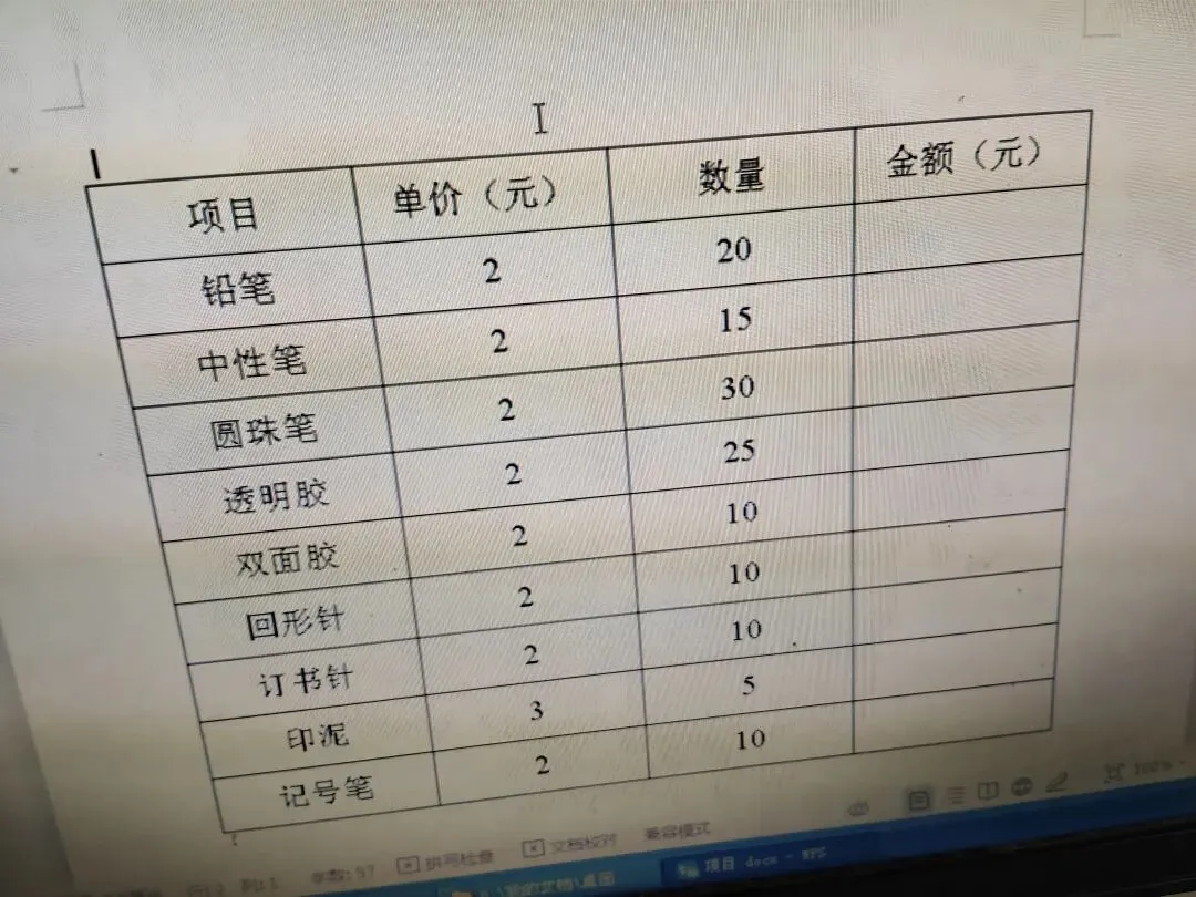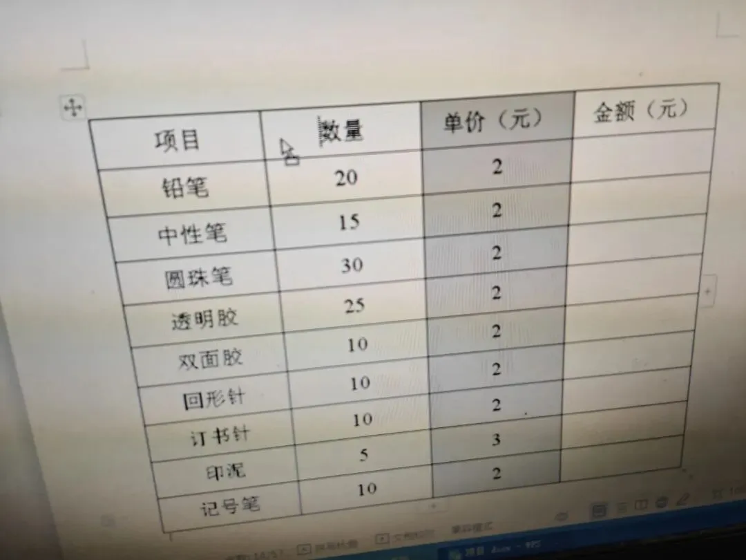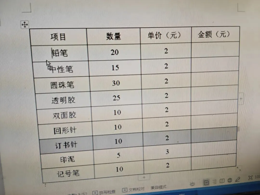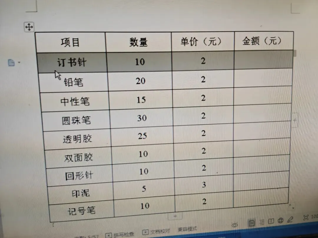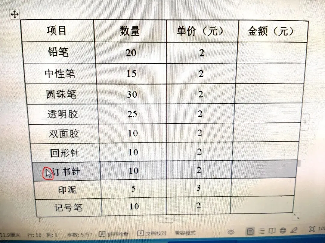 这个表格,我想把“订书针”这一行的所有数据调到“铅笔”这一行的上面,以前我是首先把“铅笔”下插入一行,把“订书针”那一行的数据复制,再粘贴,再删掉“订书针”那一行。这太慢了,要是很多的话,那效率太低了。