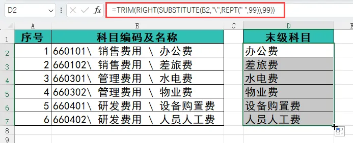 • SUBSTITUTE(B2,"\",REPT(" ",99)):将单元格中的所有反斜杠 \ 替换为 99 个空格,让不同层级的科目名称被大段空格隔开(如 “660101  销售费用  办公费”)。