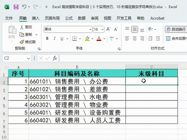 2. 选中 C2 单元格,按 Ctrl+E,Excel 会自动识别科目名称的拆分规律,一键填充所有末级科目!