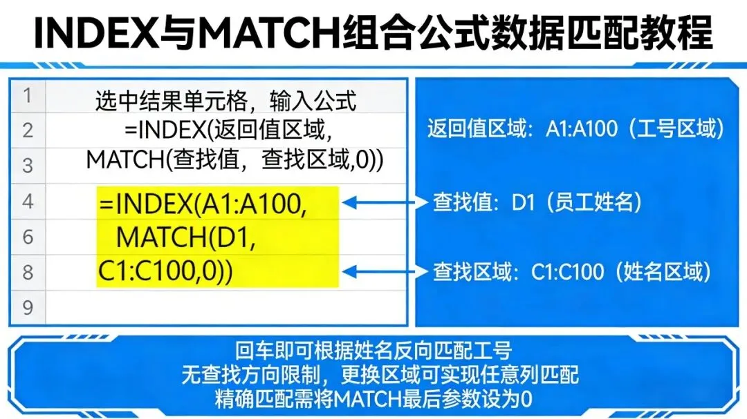 选中结果单元格,输入公式 =INDEX(返回值区域, MATCH(查找值, 查找区域,0)),比如=INDEX(A1:A100,MATCH(D1,C1:C100,0)) ;A1:A100是要返回的工号区域,D1是要查找的员工姓名,C1:C100是姓名查找区域;回车即可根据姓名反向匹配出对应工号;该组合无查找方向限制,只需更换返回值区域和查找区域,就能实现任意列的数据匹配,精确匹配需将MATCH最后一个参数设为0。