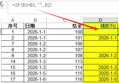 第一步:添加一个辅助列,用公式=IF(B2=B3,"",B2),找到每个日期对应的最后一行,也就是当天最终结余金额。