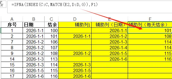 第二步:添加两个辅助列,一列直接把1月1日-1月6日日期列在这,然后用公式:=IFNA(INDEX(C:C,MATCH(E2,D:D,0)),F1),取到每天对应结余金额。