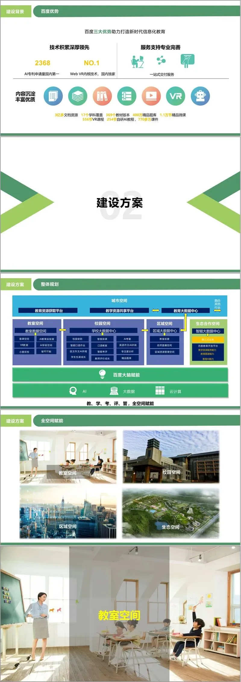 与此同时,方案展示了其在内容、技术和服务方面的深厚积淀。文件指出,其在人工智能领域的专利申请量位居国内前列,并拥有Web VR内核等独家技术。在资源层面,更是构建了令人瞩目的内容生态:覆盖17个学科、369个教材版本的3亿多文档资源,400万精品题库,超过1.1万节精品微课,以及数百节VR课程和自研AI教程。这些数据共同构成了方案实施的坚实基础,形成了“内容沉淀丰富优质、技术积累深厚领先、服务支持专业完善”的三大核心优势。