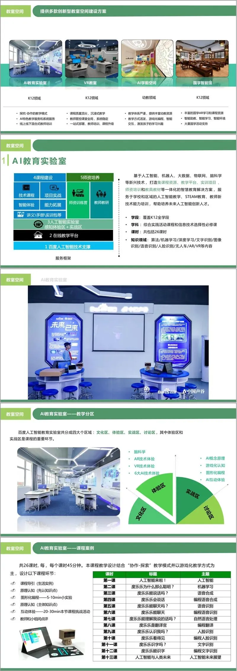- AI教育实验室:基于人工智能、机器人、大数据、物联网、脑科学等技术,打造集课程、平台、实训、师资培训于一体的解决方案。实验室分为文化区、体验区、实战区和讨论区,设计了涵盖K12全学段的26课时课程,内容涉及算法、机器学习、深度学习乃至AR/VR等多个前沿领域。其教学模式强调“协作-探索”与游戏化,并配套了线上线下结合的教师培训体系。