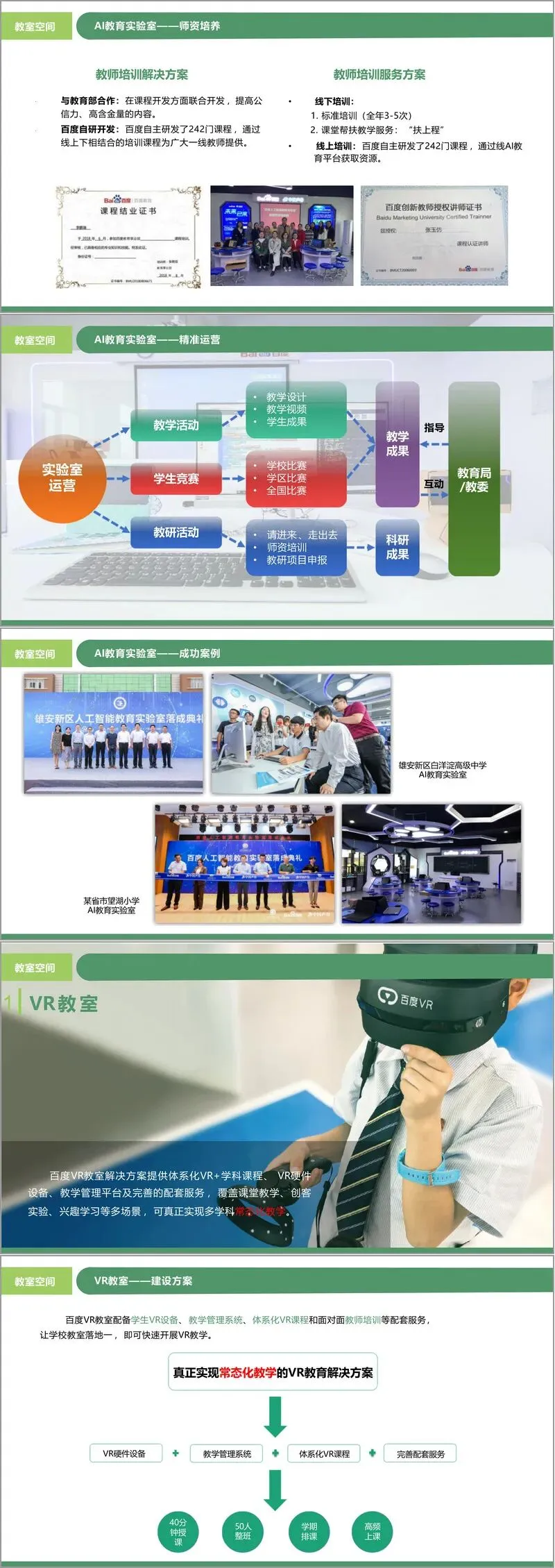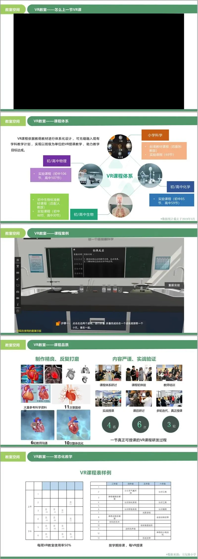 - VR教室:提供体系化的VR学科课程、硬件设备、管理平台与配套服务。课程严格依据教材大纲设计,覆盖小学科学到初高中的物理、生物、化学等学科,旨在实现多学科常态化教学。文件展示了从课程研发到实战授课的严谨流程,以及在实际学校中取得的良好应用效果(如使用率提升)。