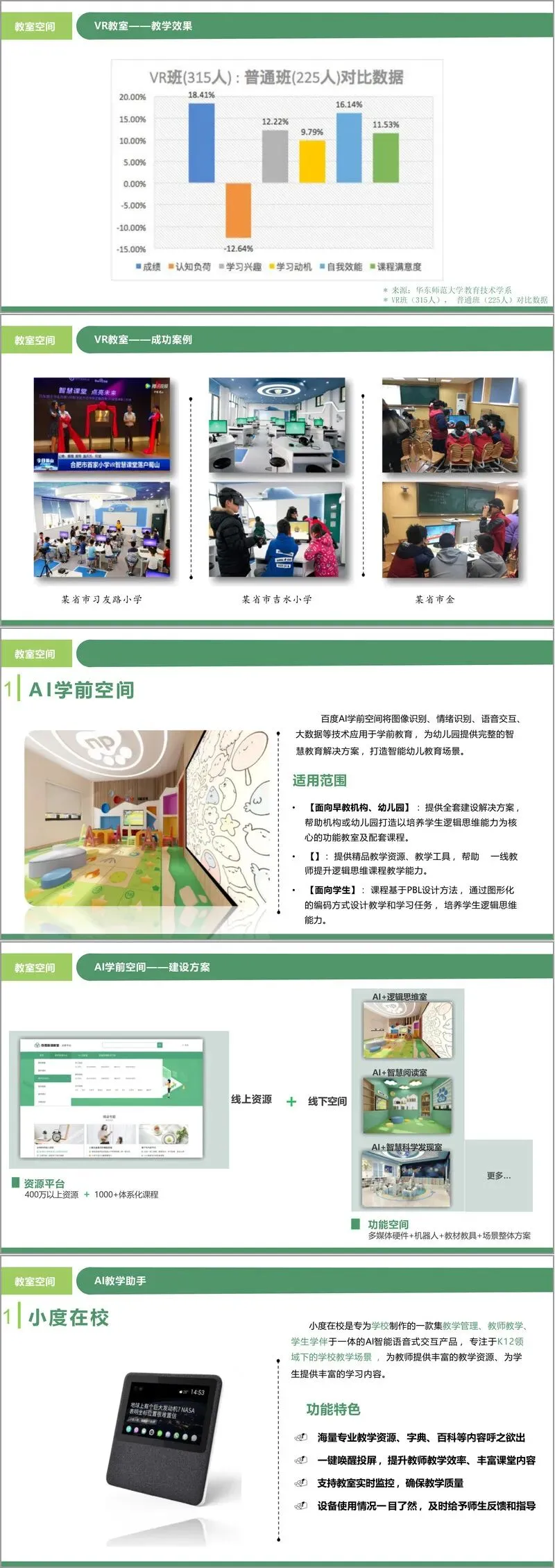 - AI学前空间:将图像识别、情绪识别、语音交互等技术应用于学前教育,为幼儿园和早教机构提供以培养逻辑思维能力为核心的功能教室、配套课程与教学资源。