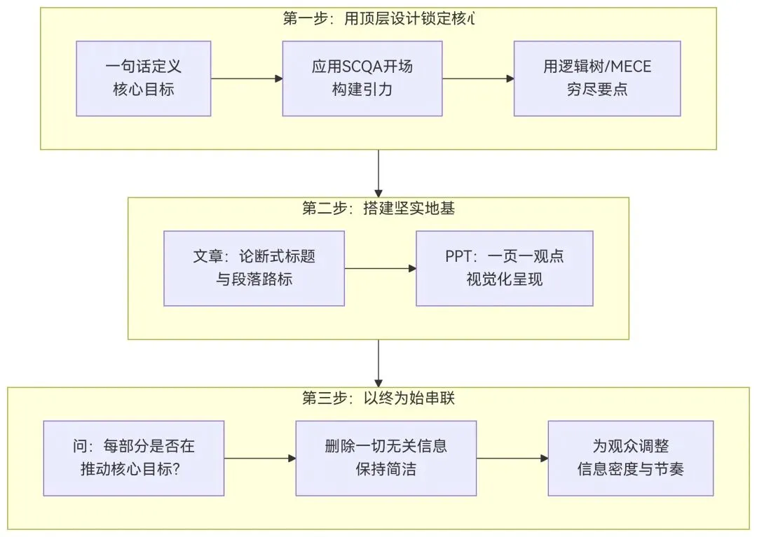 结构化表达的核心心法是从“自我倾诉”转向“听众引导”,不是“记录我知道什么”,而是“设计一段理解之旅”,让听众用最少的认知负荷、在最短的时间内get到最重要的信息。