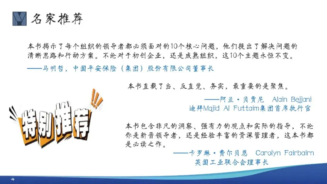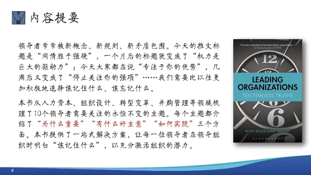 《麦肯锡领导力-领先组织10律》由麦肯锡高级合伙人Scott Keller与Mary Meaney所著,聚焦组织领导的10个永恒主题并分为“人才与团队”“决策和计划”“文化和变革”三大部分。