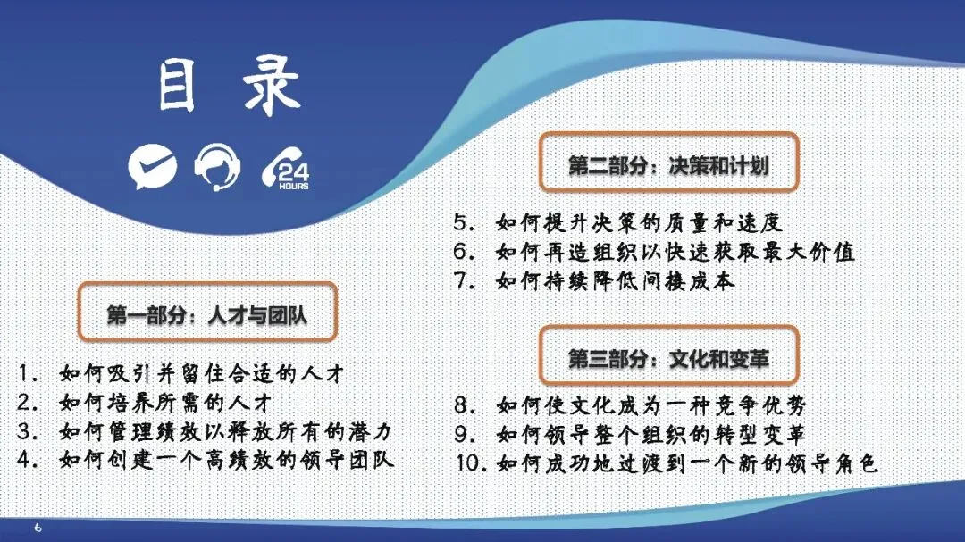 每主题均从“为什么重要”“有什么好主意”“如何实现(多采用五步法则)”展开;核心亮点包括:卓越人才生产力是普通员工的8倍、仅23%的公司能做好组织再造、文化可解释50%的事业部绩效差异,同时提供了吸引头部5%人才、70/20/10人才培养模式、三类决策分类等实操策略。