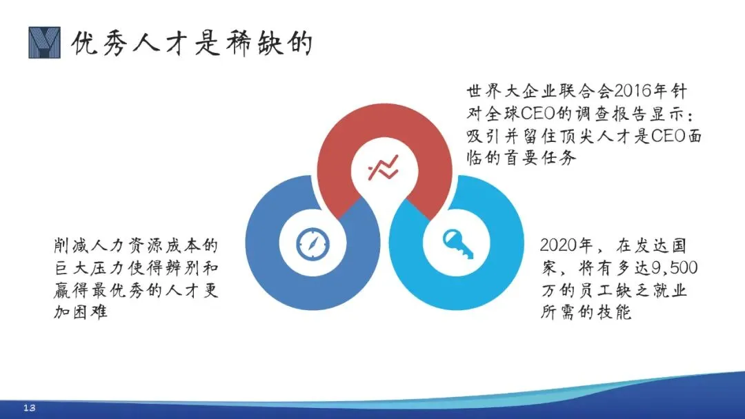 人才稀缺性:2016年全球CEO首要任务是“吸引并留住顶尖人才”,2020年发达国家将有9500万员工缺乏就业技能。