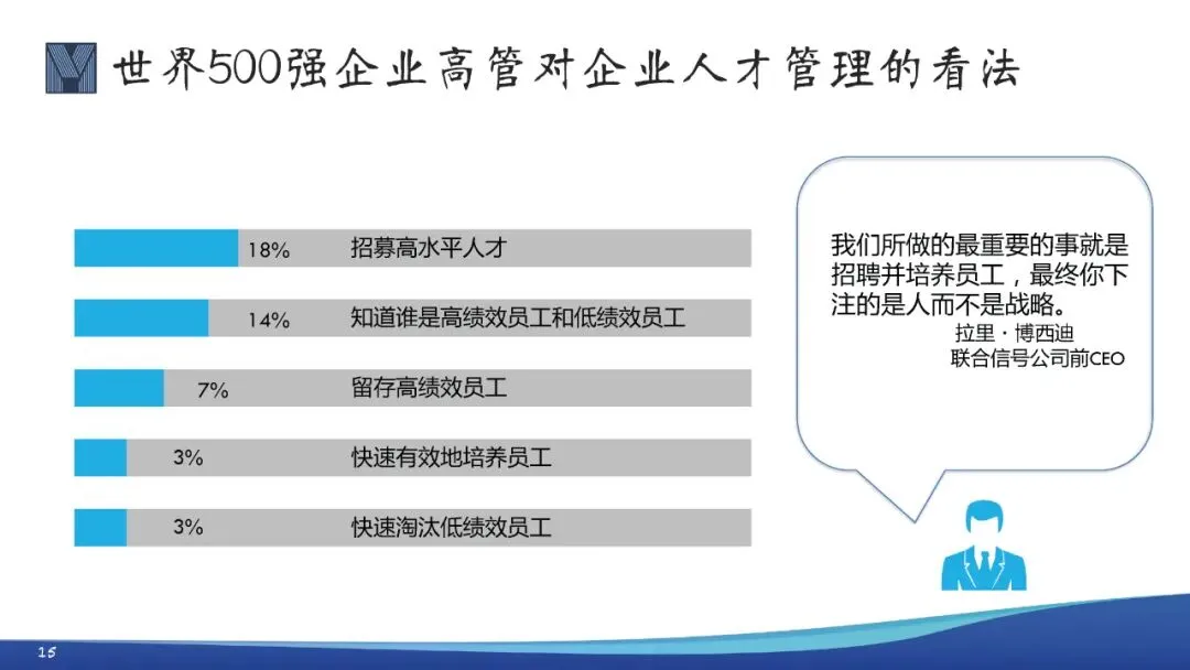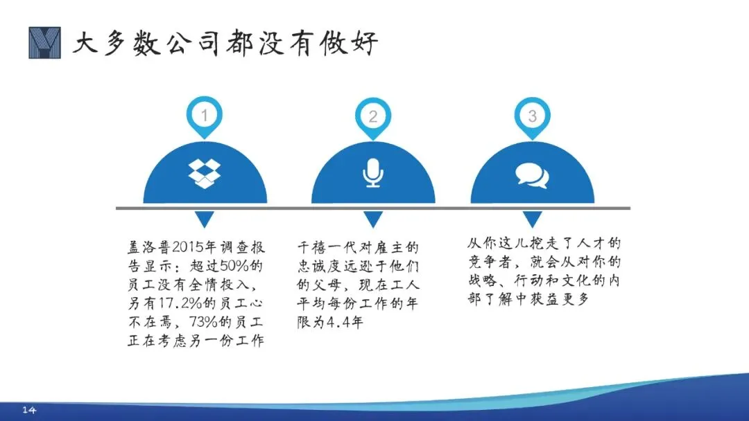 企业现状:盖洛普2015年调查显示,50%+员工未全情投入,73%员工考虑换工作;仅18%世界500强企业擅长招募高水平人才,3%擅长快速培养员工。