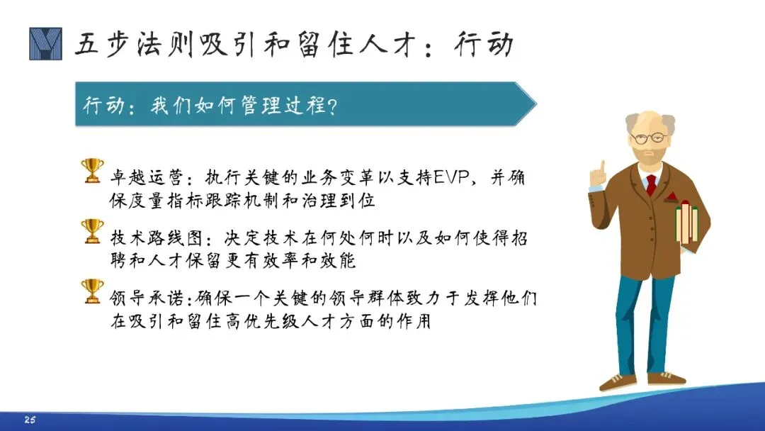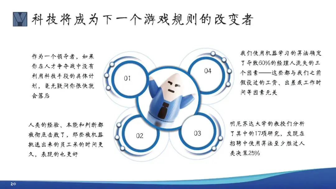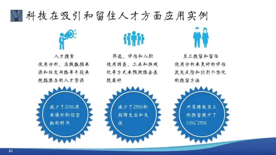 科技赋能:用机器学习预测人员流失(识别60%经理人流失因素)、算法筛选员工(比人类决策优25%),可减少20%职位填补时间、10%-25%高绩效员工挽留率。