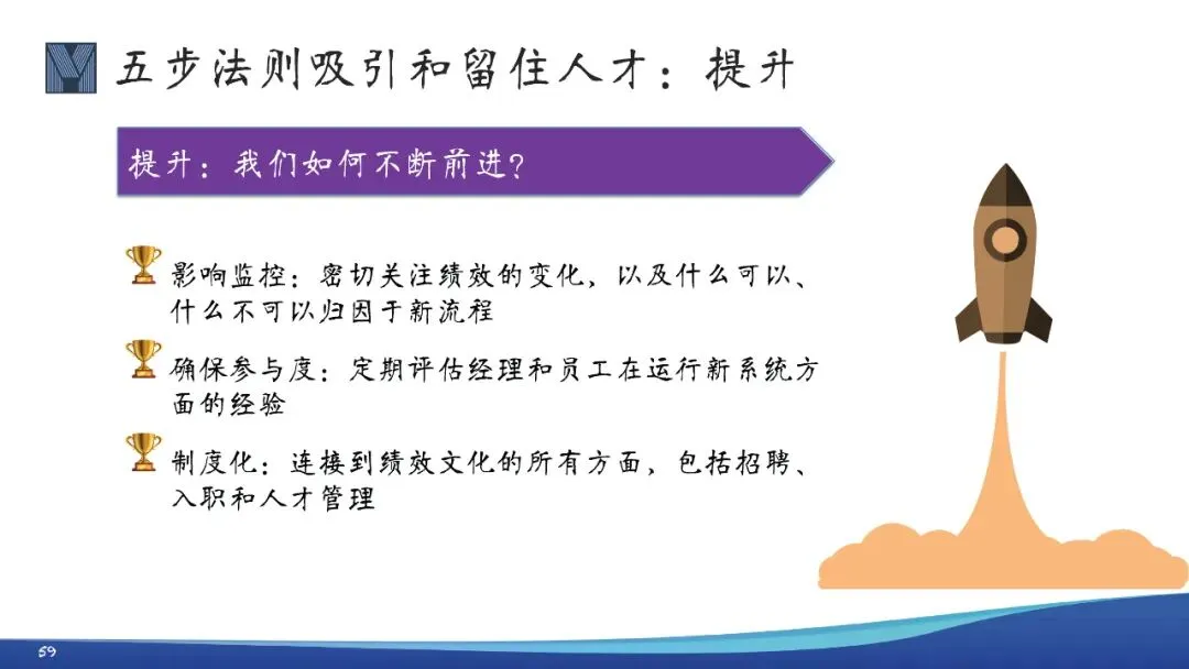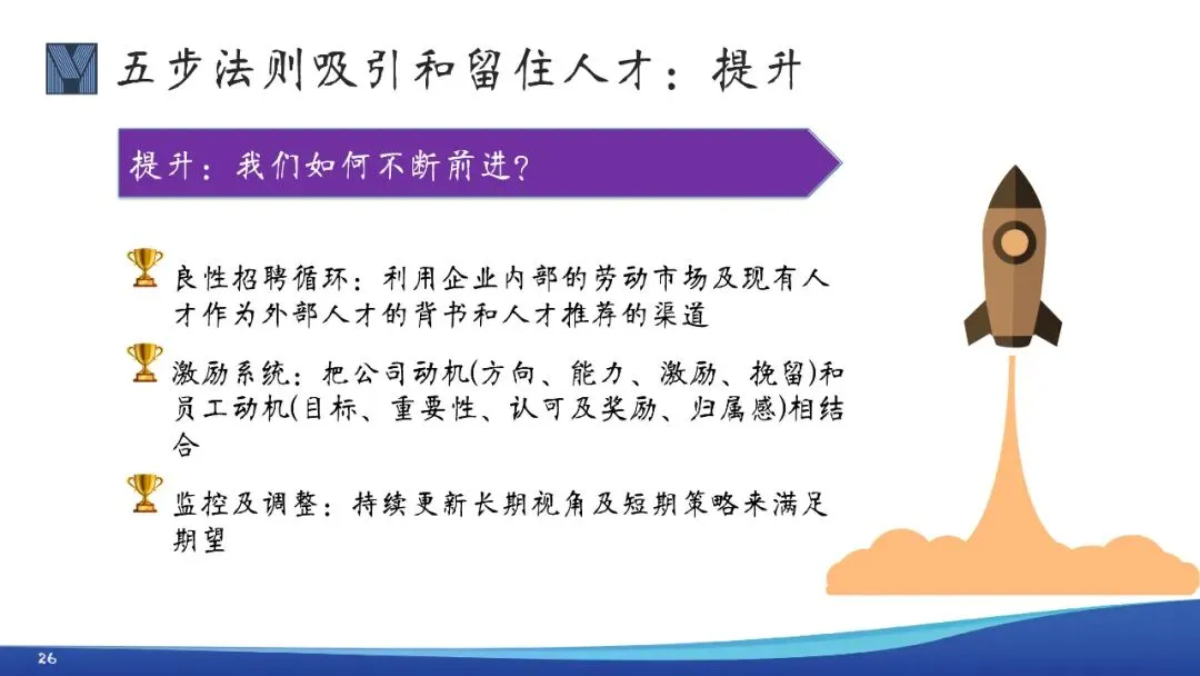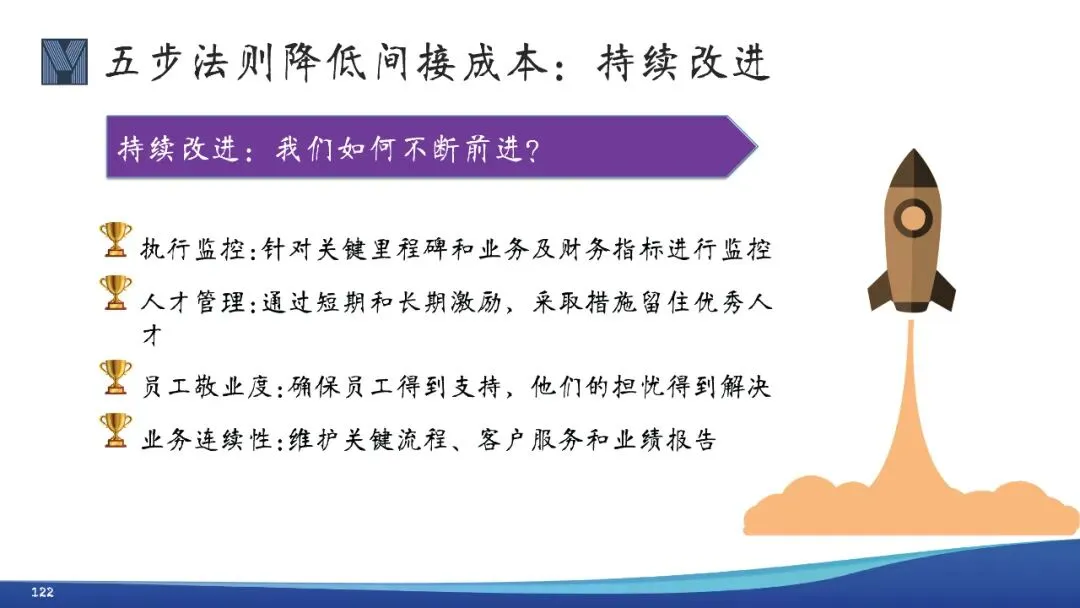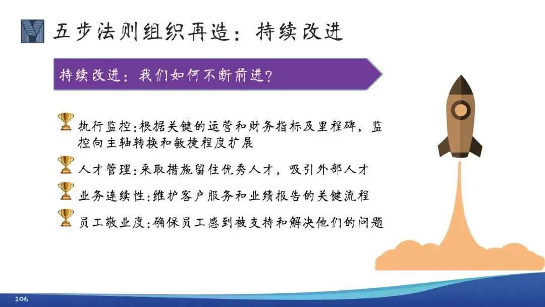 持续改进:监控关键里程碑与财务指标,用短期+长期激励留住优秀人才,解决员工担忧,维护客户服务/业绩报告流程。