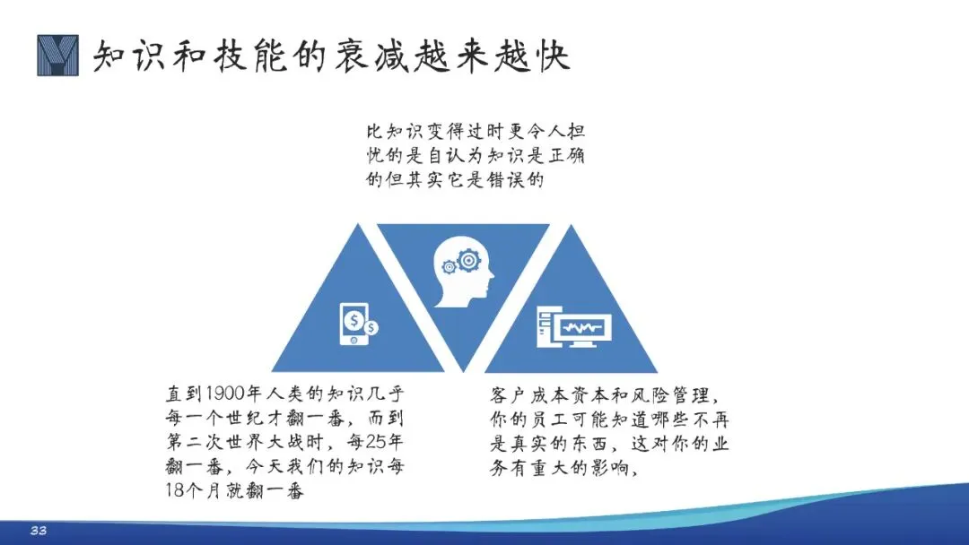 知识衰减加速:人类知识从“每世纪翻一番”(1900年)变为“每18个月翻一番”,员工可能持有过时知识,影响业务决策。