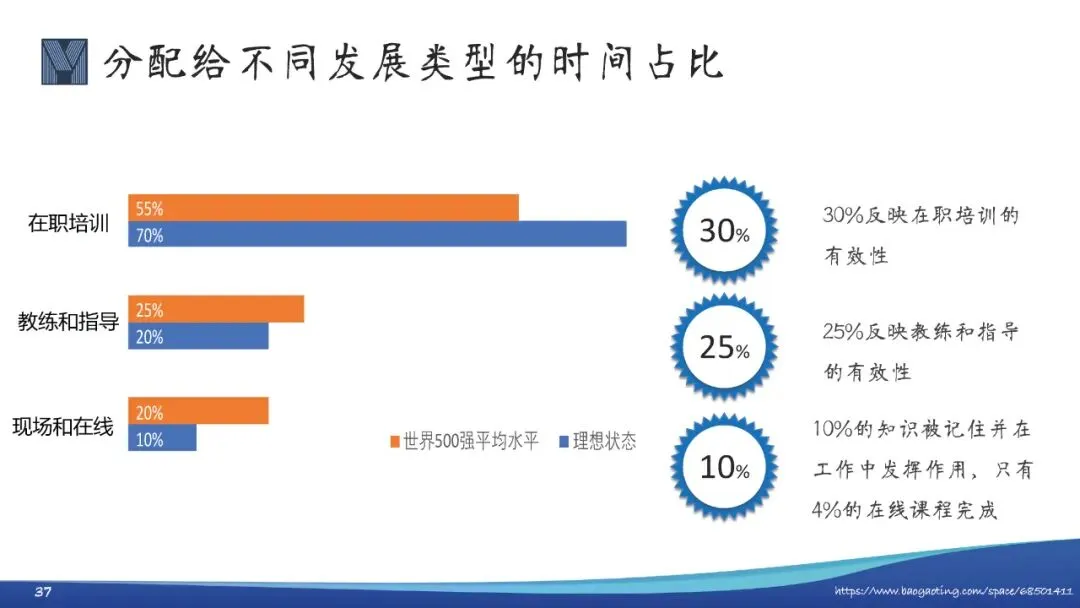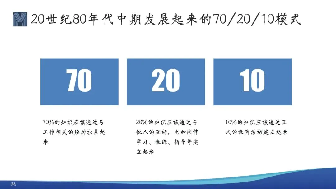 采用70/20/10培养模式:70%知识来自工作经历,20%来自同伴学习/教练,10%来自正式教育(当前企业平均仅55%/25%/20%,需调整)。