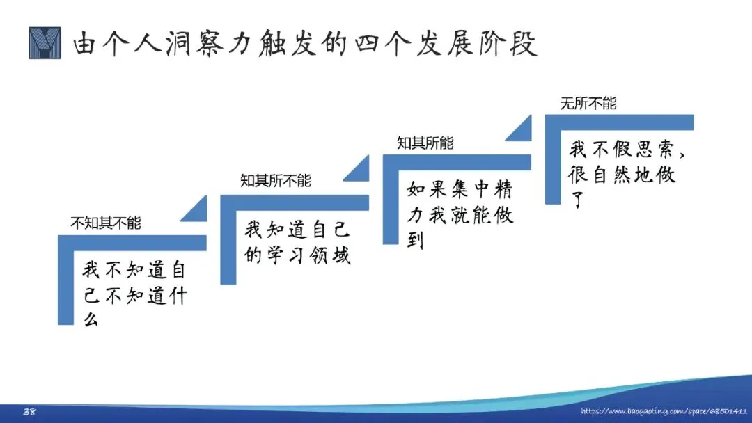 个性化培养:基于“不知其不能→知其不能→知其所能→自然做到”四阶段,触发个人洞察力,避免通用化方案。