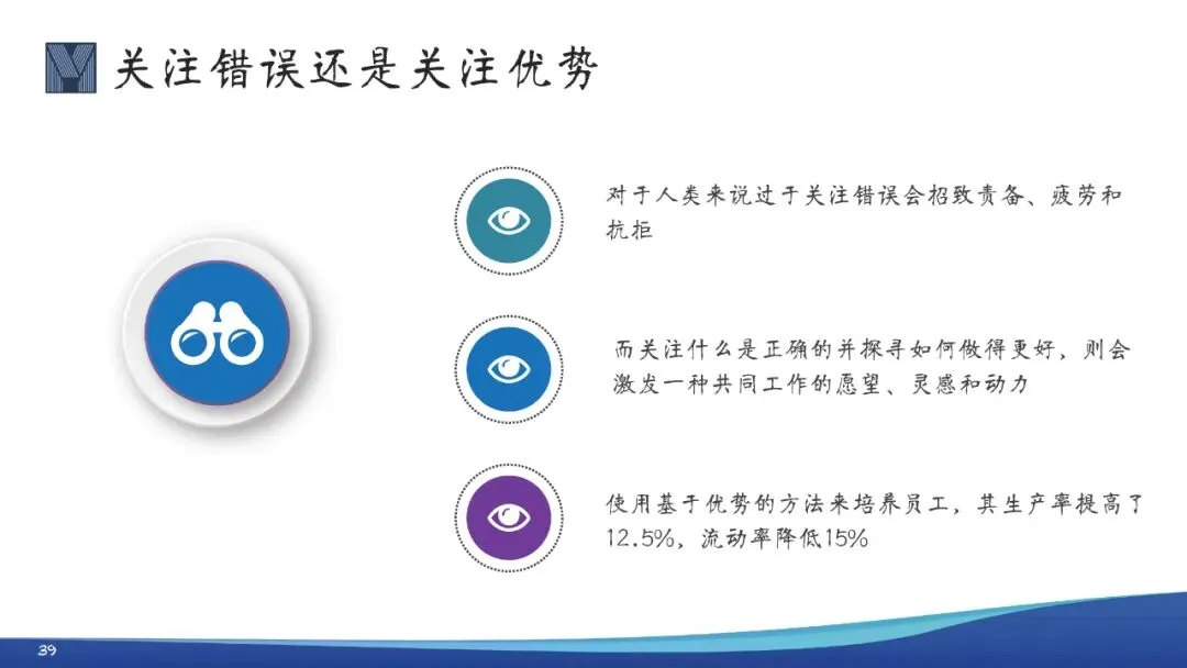 关注优势而非错误:基于优势的培养可使生产率提升12.5%,流动率降低15%;通过“创造优势使用机会、让员工传授优势”巩固优势,通过“故意挑战、同伴促进”建立新优势。