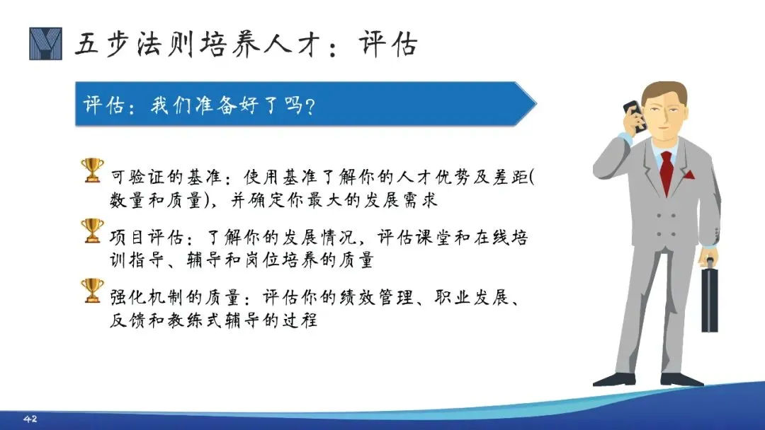 评估:用基准分析人才差距,评估培训(课堂/在线/辅导)质量及绩效管理流程有效性。