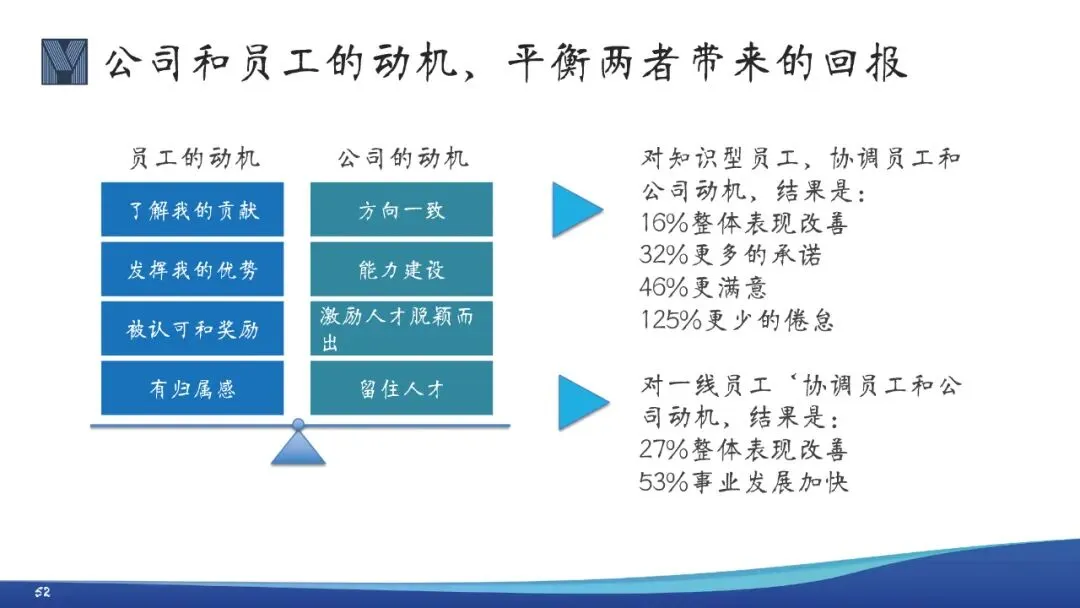 动机协调价值:协调公司与员工动机后,知识型员工表现提升16%、承诺度提升32%、倦怠减少125%;一线员工表现提升27%、事业发展加快53%。
