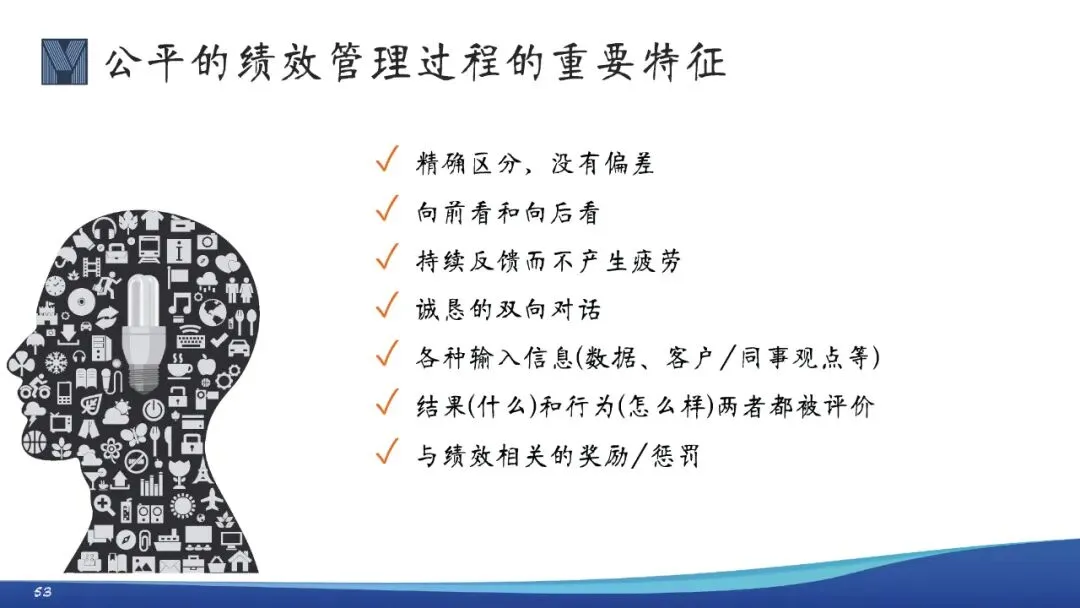 确保过程公平:绩效管需具备“精确区分无偏差、向前+向后看、持续反馈、双向对话、多输入信息、评价结果+行为、关联奖惩”七大特征。