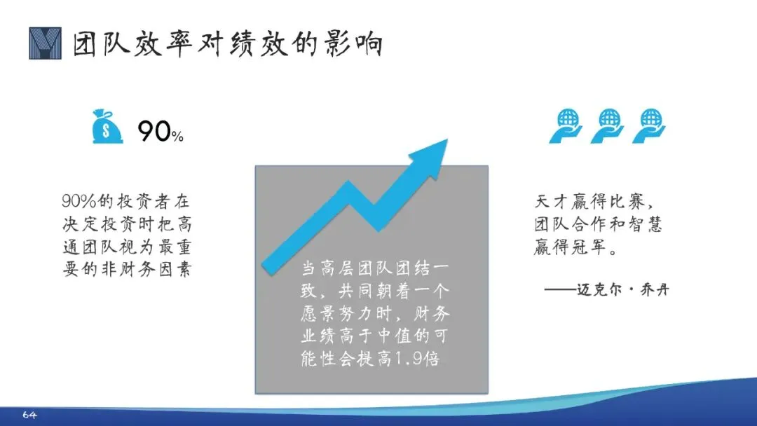 团队价值:90%投资者将高管团队视为投资决策的最重要非财务因素,团结一致的高管团队财务业绩高于中值的1.9倍。