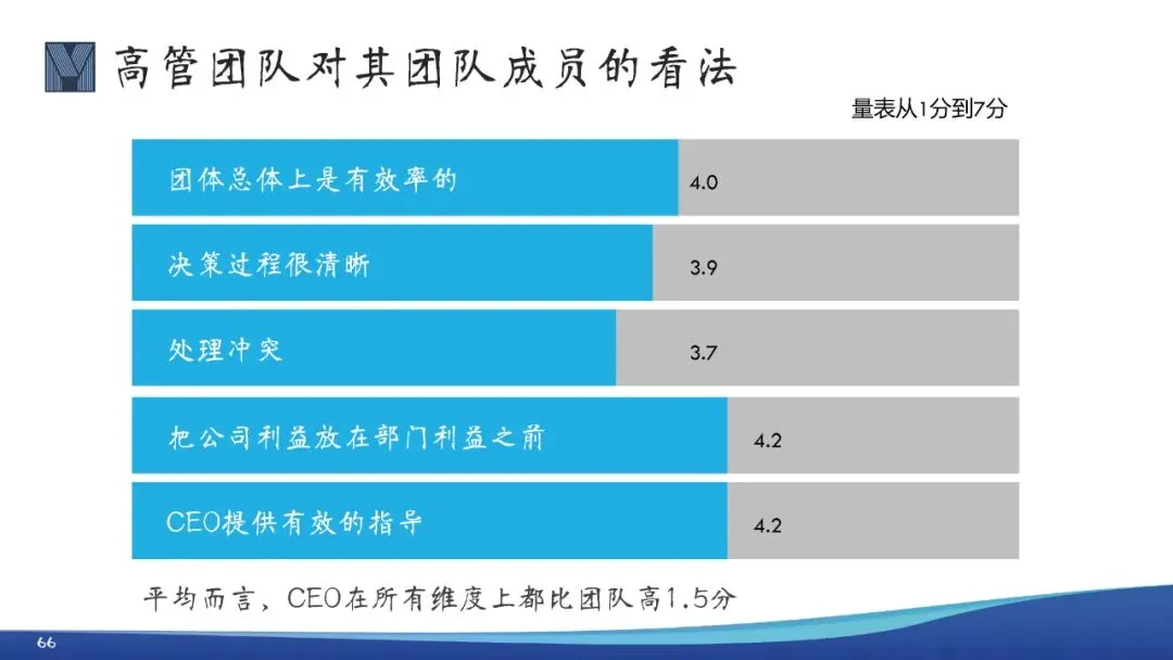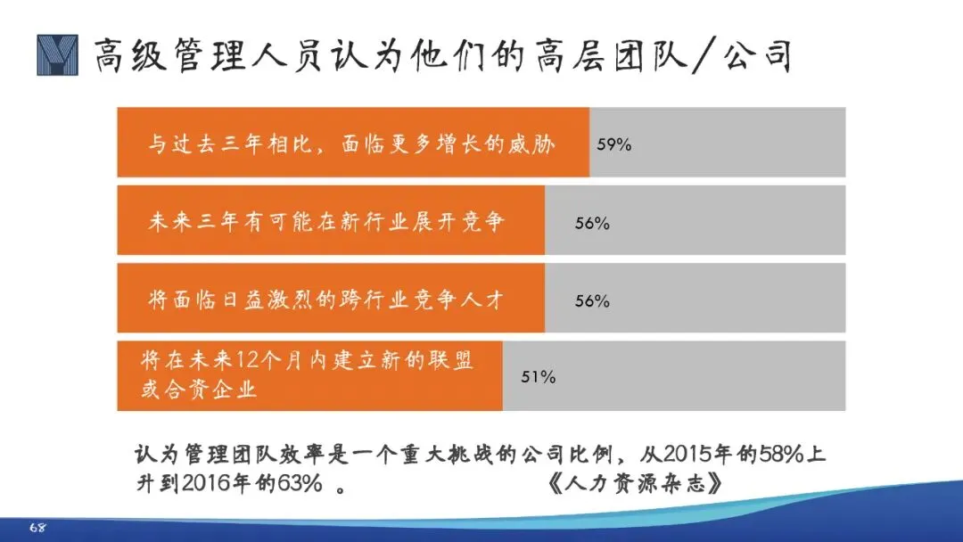 团队现状:高管团队自评“处理冲突”仅3.7分(1-7分制),“整体效率”4.0分;CEO对团队评价比成员高1.5分(认知偏差);2016年63%企业认为管理团队效率是重大挑战(2015年为58%)。