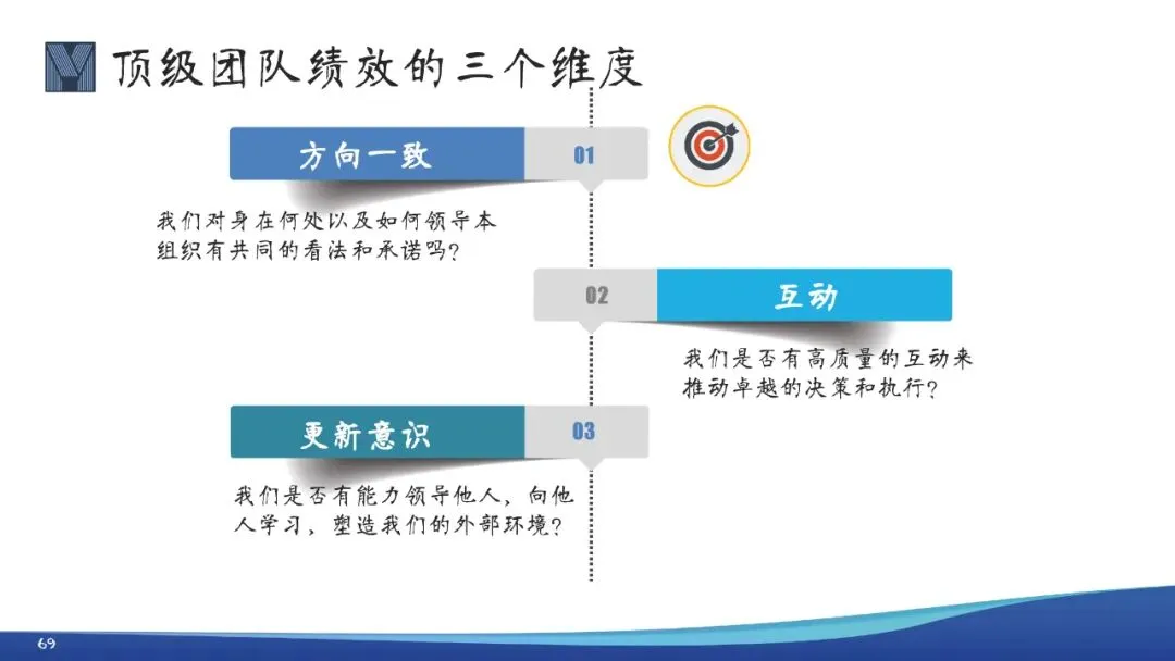三维度衡量团队绩效:方向一致(共同愿景与承诺)、互动(高质量决策与执行对话)、更新意识(领导他人、学习能力、塑造外部环境)。