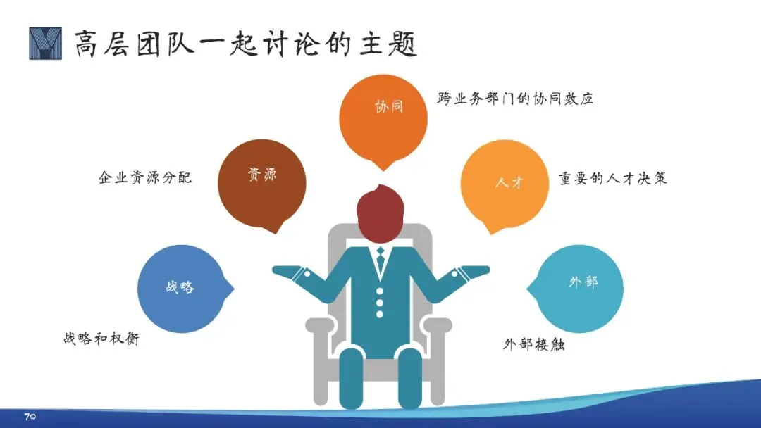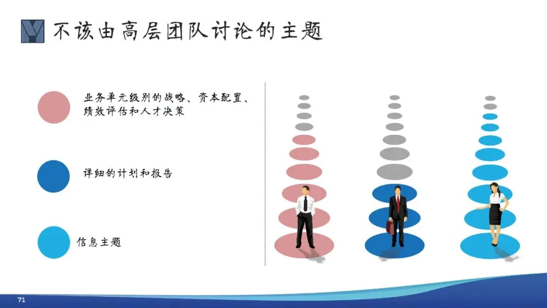 聚焦团队专属工作:高管团队应讨论“跨业务协同、重要人才决策、企业资源分配、战略权衡、外部接触”,避免介入“业务单元战略、详细计划、信息汇报”。