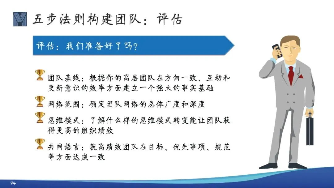评估:建立团队基线(方向一致/互动/更新意识),了解团队网络广度,统一高绩效团队的共同语言。