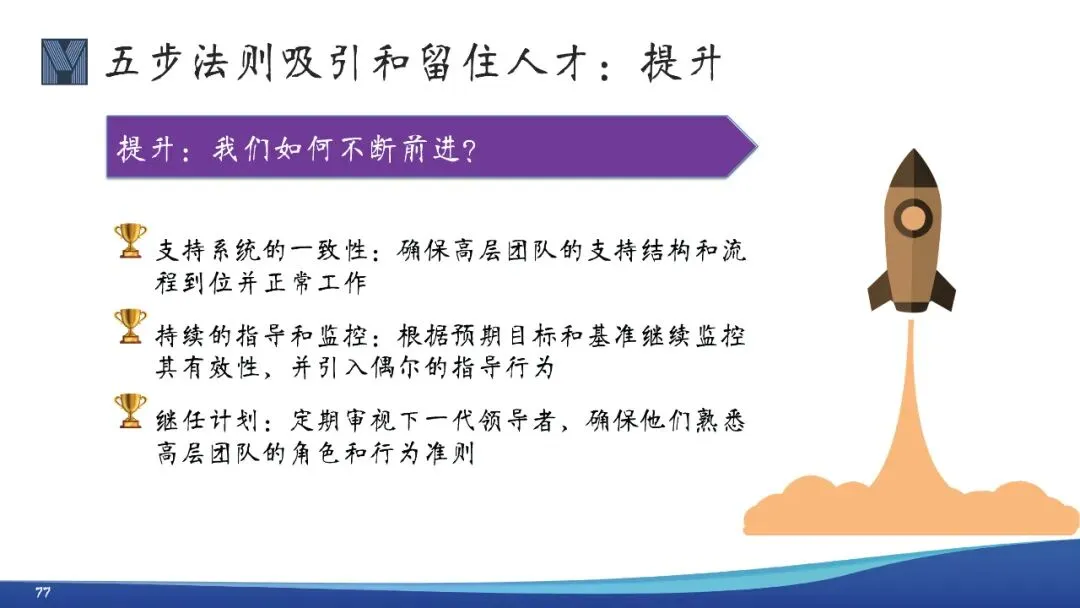 提升:确保支持系统(流程/工具)到位,持续监控团队有效性,定期审视下一代领导者(熟悉高管角色)。