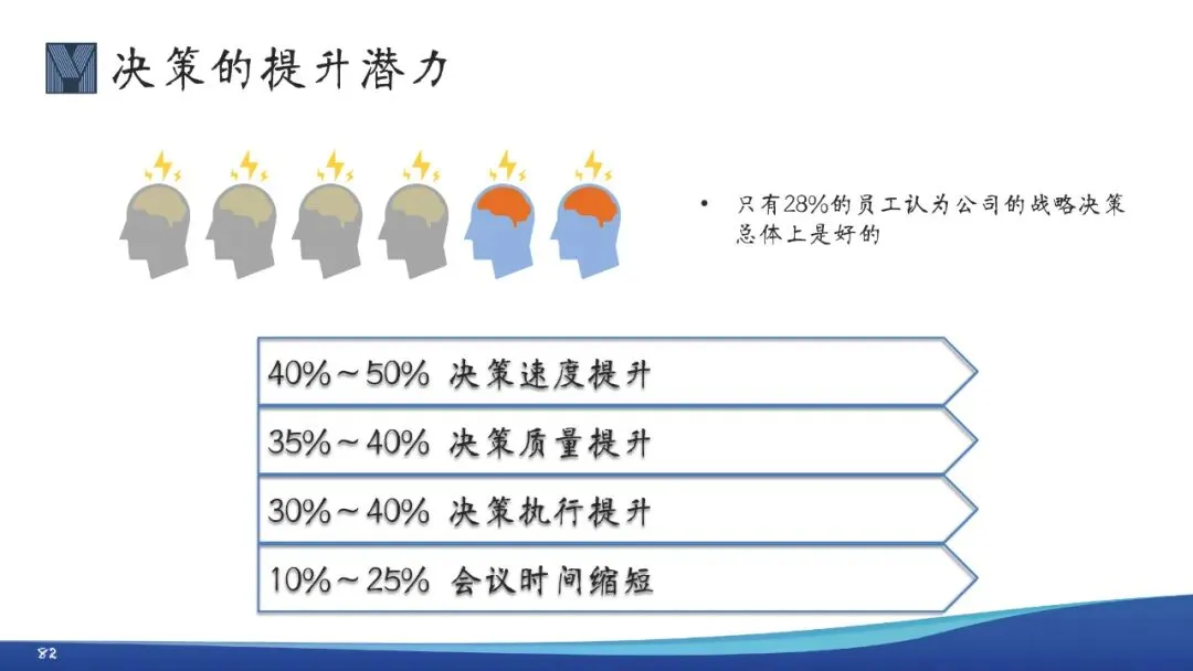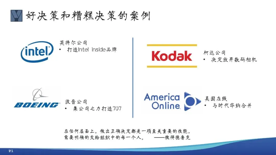 决策影响:好决策可使公司脱颖而出(如英特尔“Intel inside”),坏决策导致失败(如柯达放弃数码相机);决策速度可提升40%-50%,质量提升35%-40%,执行提升30%-40%。